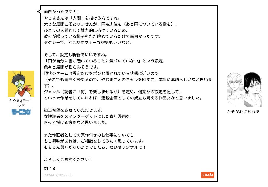 マンガ家が何を描けるか、商業作品としてどうすれば面白いマンガになるか、ということを一緒に考えてくれる方だろうなとコメントを読んで感じました。