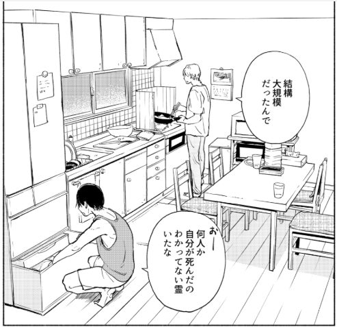 そうですね…。例えば登場人物の志位くん・円先輩が志位くんの家にいるシーンなんですが、コンロのところに油跳ね防止シートが立ててありますよね。志位くんの料理の所作や円先輩の自由な様子も細かく描かれています。たった1シーンから二人の関係性が読み取れるし、そこを楽しんで描いている人なんだと感じました。