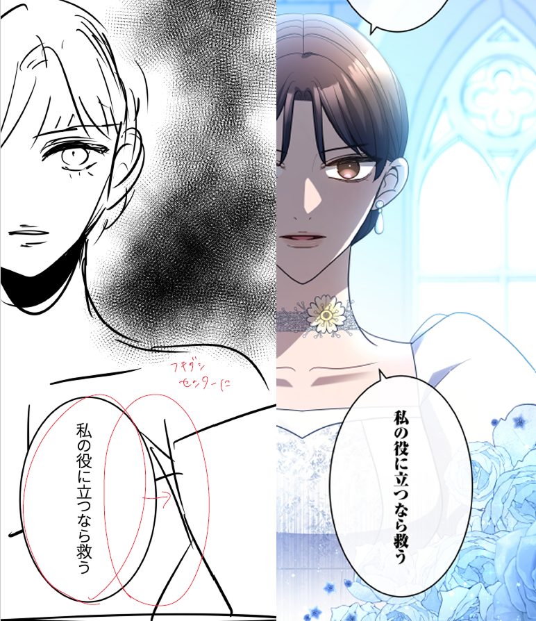 タテ読みマンガでは読者の視線がスマートフォンの中央に固定されるので、読ませたいセリフは中央に持ってきたいんですよね。